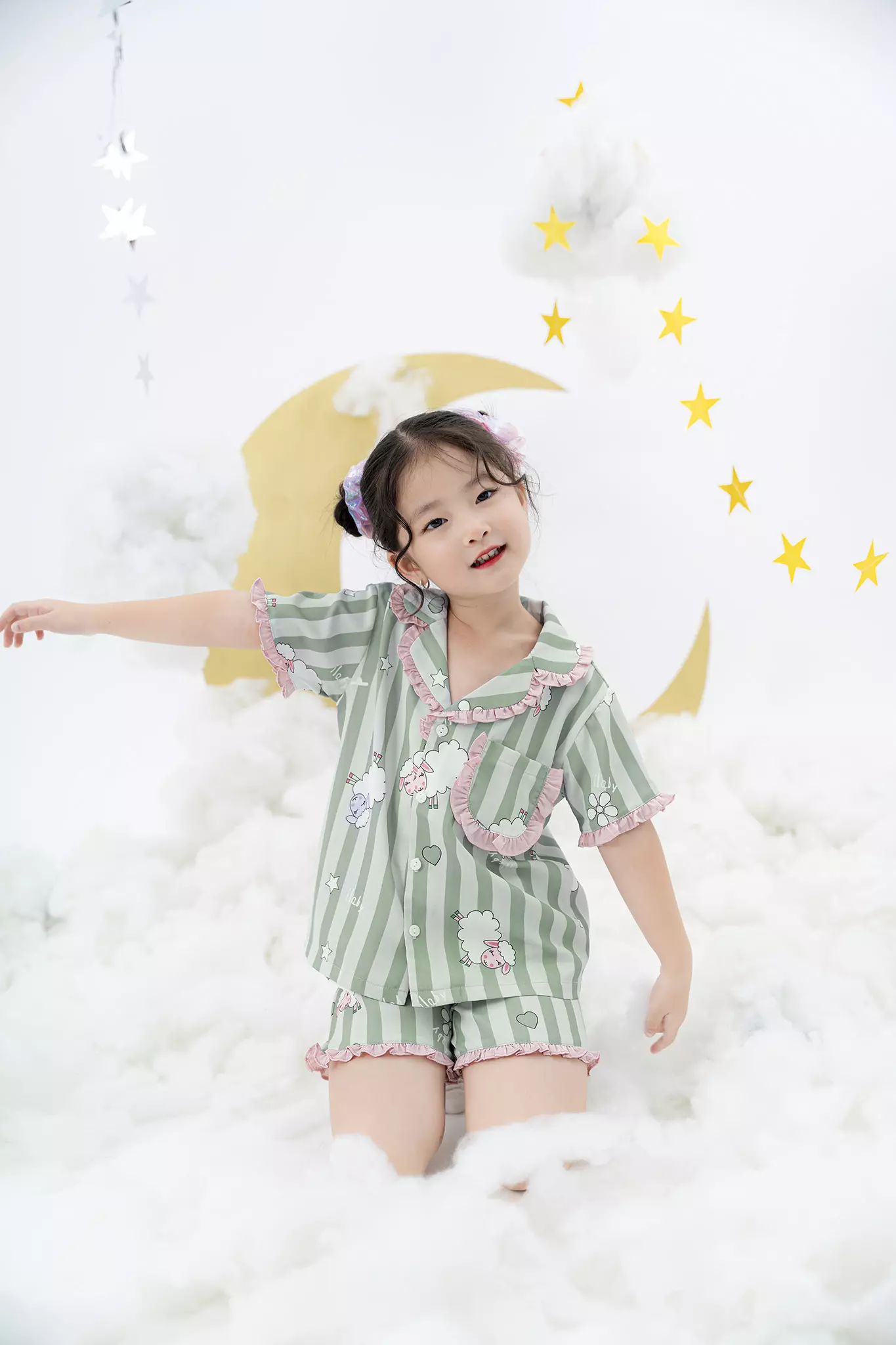 - Thiết kế: bộ pyjama kẻ sọc cổ bẻ ve phối bèo khác màu và những chú cừu toạ cảm mềm mại khi con mặc.