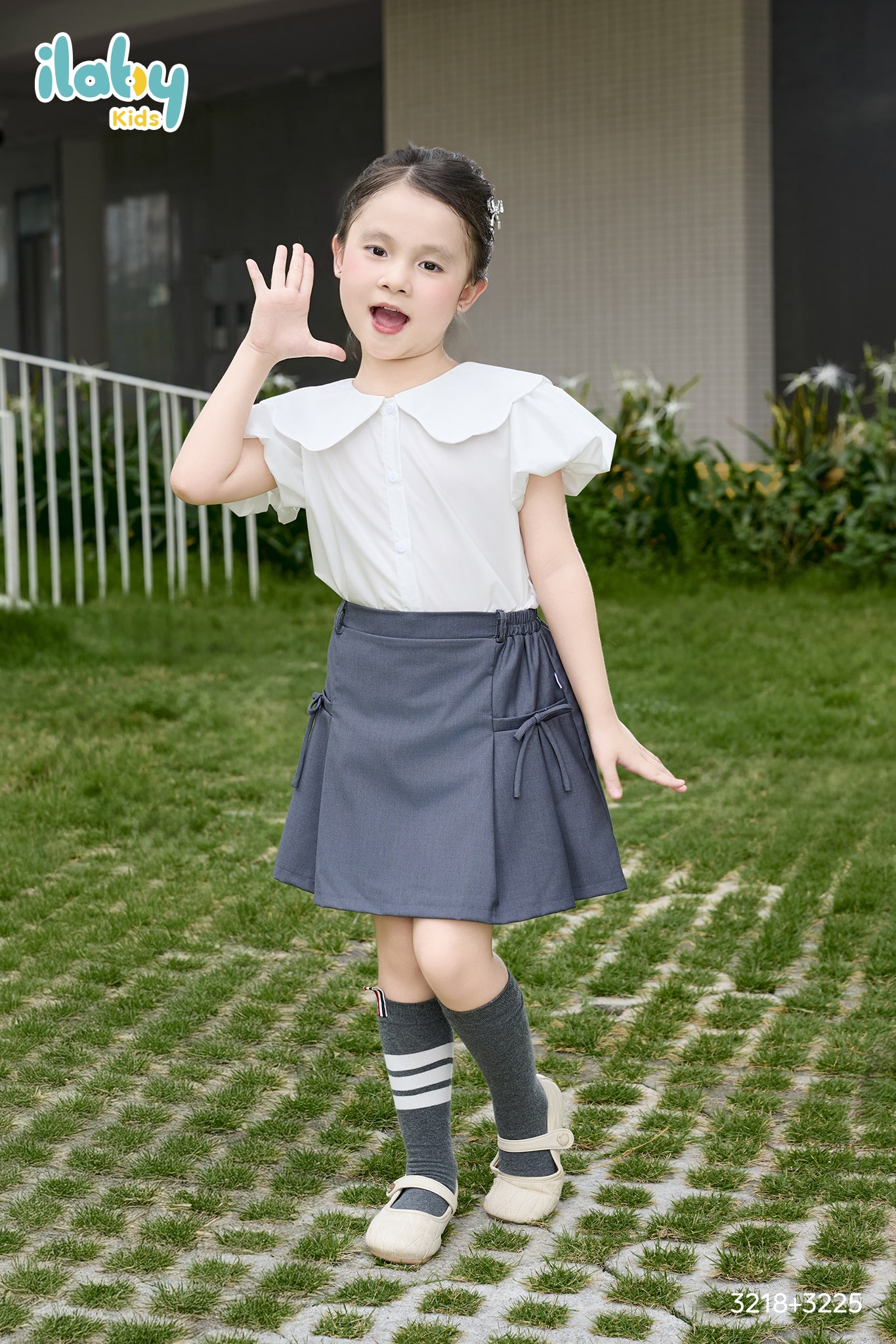 👗 Tên sản phẩm: Bộ quần áo bé gái ILABY mặc đi học – Áo trắng cổ bèo + chân váy nơ