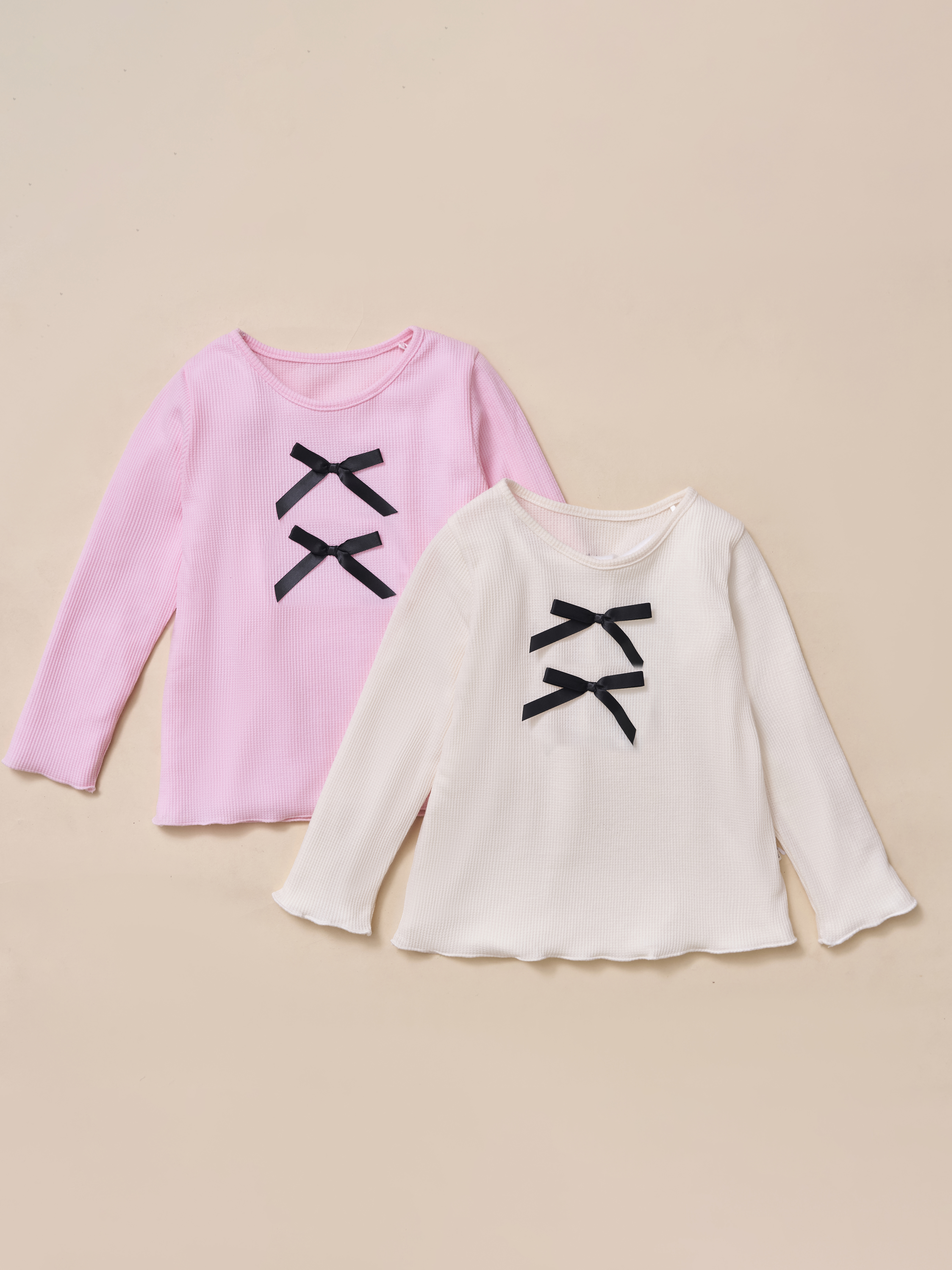 🌟 Họa tiết: Áo thun dài tay dáng cơ bản. cổ tròn chui đầu. Áo cuốn bèo gấu và tay. Trước ngực đính 2 nơ ruy băng trang trí