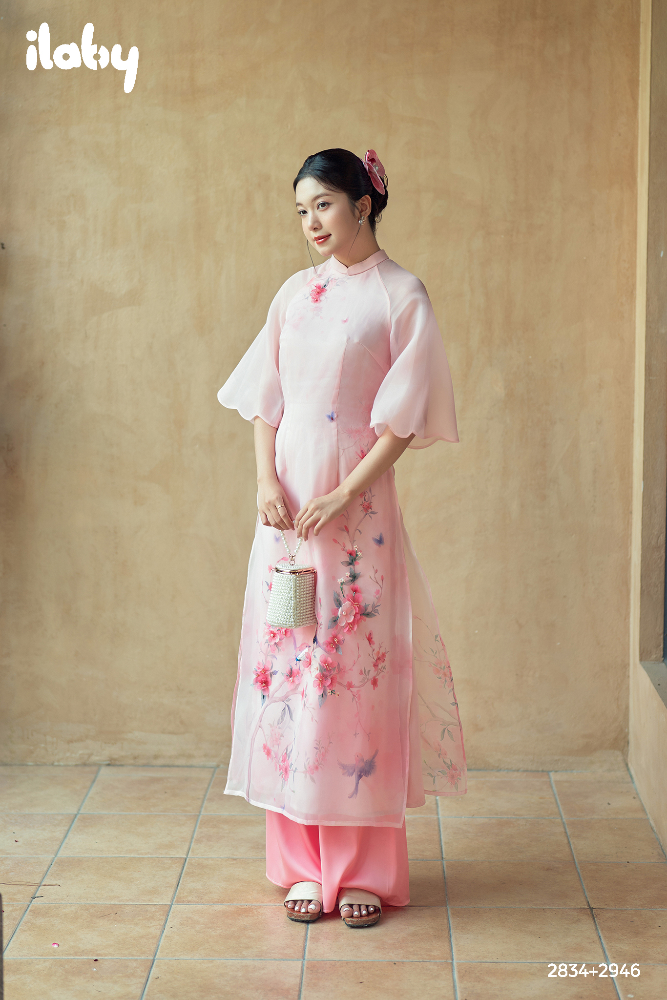 🌸 Họa tiết áo dài nữ: Áo dài mẹ tơ 4 tà in hình thiết kế trên vải tơ oganza, có lót lụa tà trong. Tay tơ may lượn sóng lộn sạch với lớp lưới, cổ tàu khóa kéo thân sau. Đính kết trang trí 3D hình thân trước
