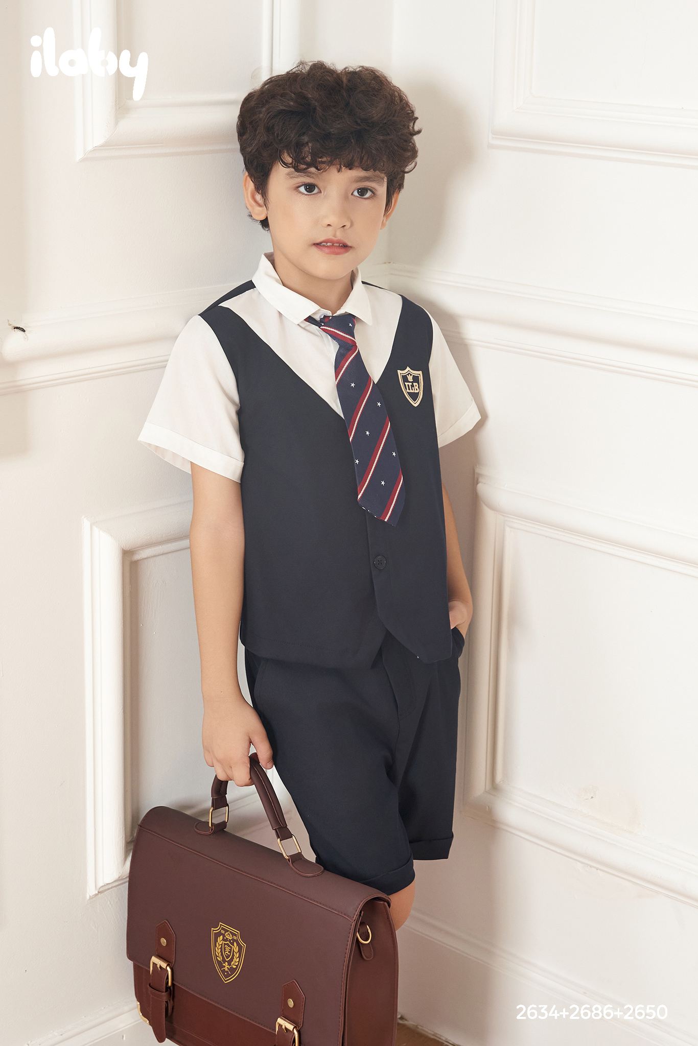 🌟 Họa tiết áo sơ mi bé trai giả gile: Áo mix cổ đức vải phối thô, cộc tay thân giả gile cài cúc thân trước