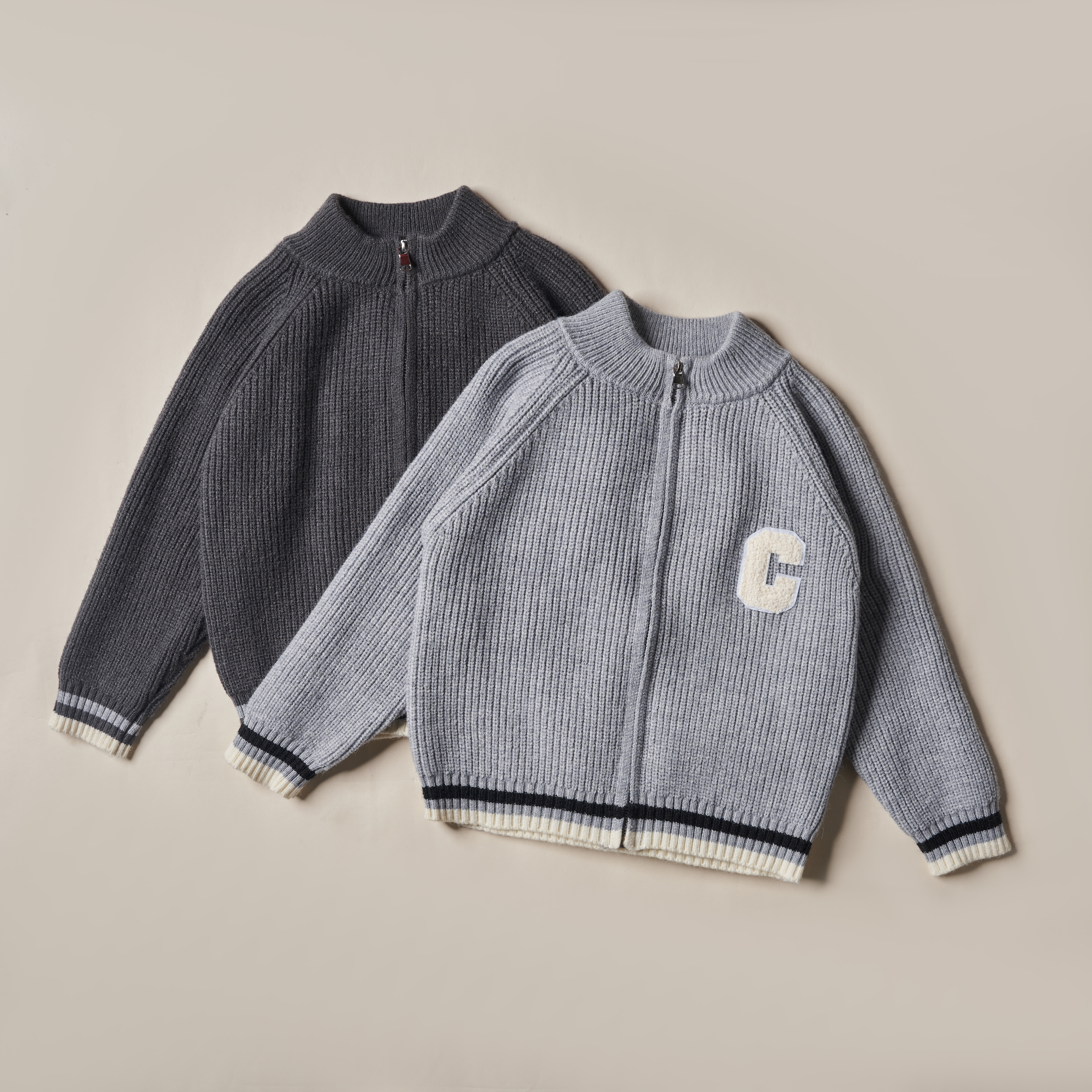 🌸 Họa tiết áo len bé trai: Áo khoác len khóa kéo cổ tròn cao , tay vạt bo phối viền, stick chữ C