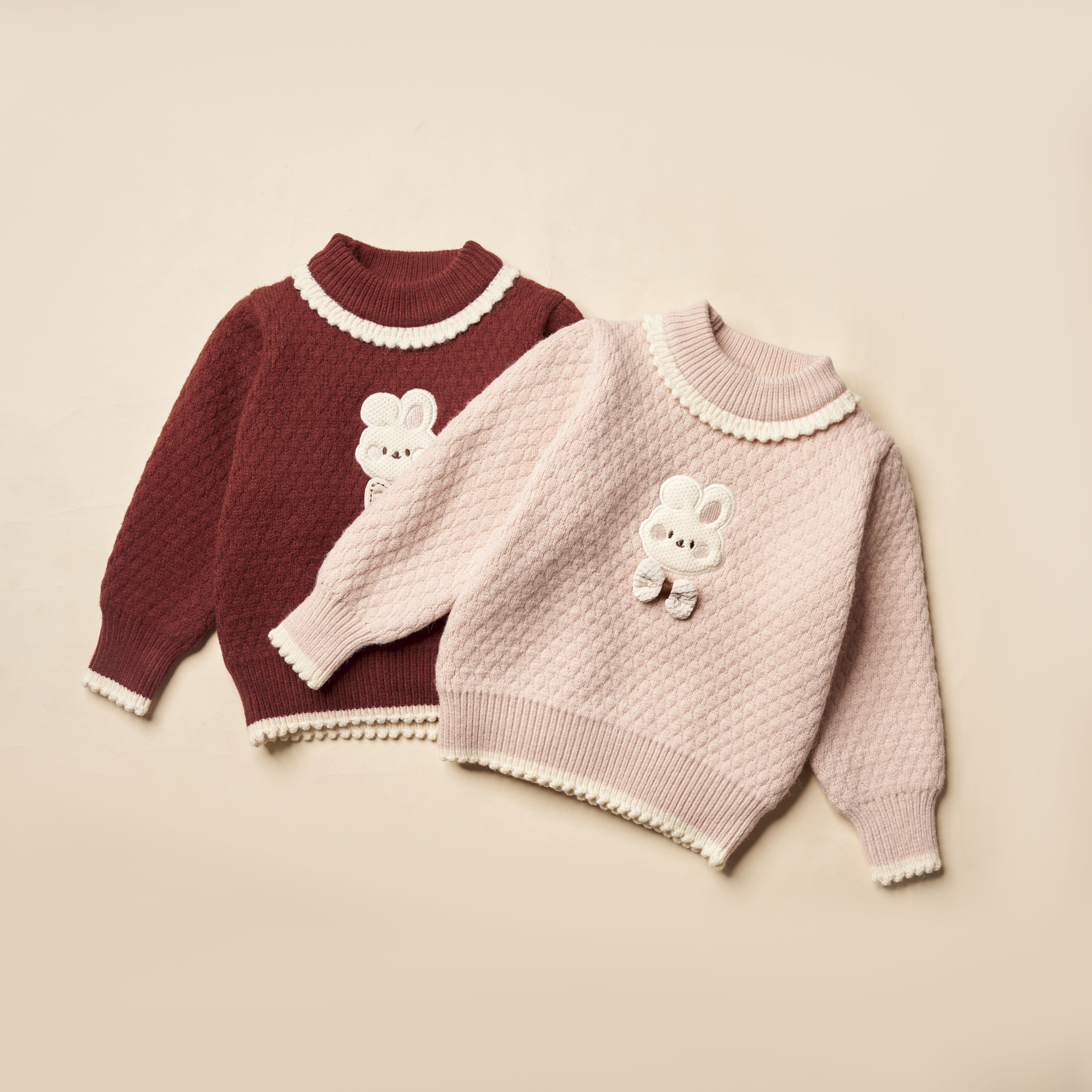 🌸 Họa tiết áo len bé gái: Áo len chui đầu chất len có lót lông mềm mại, len bề mặt nổi họa tiết, đính thêm thỏ trước ngực.