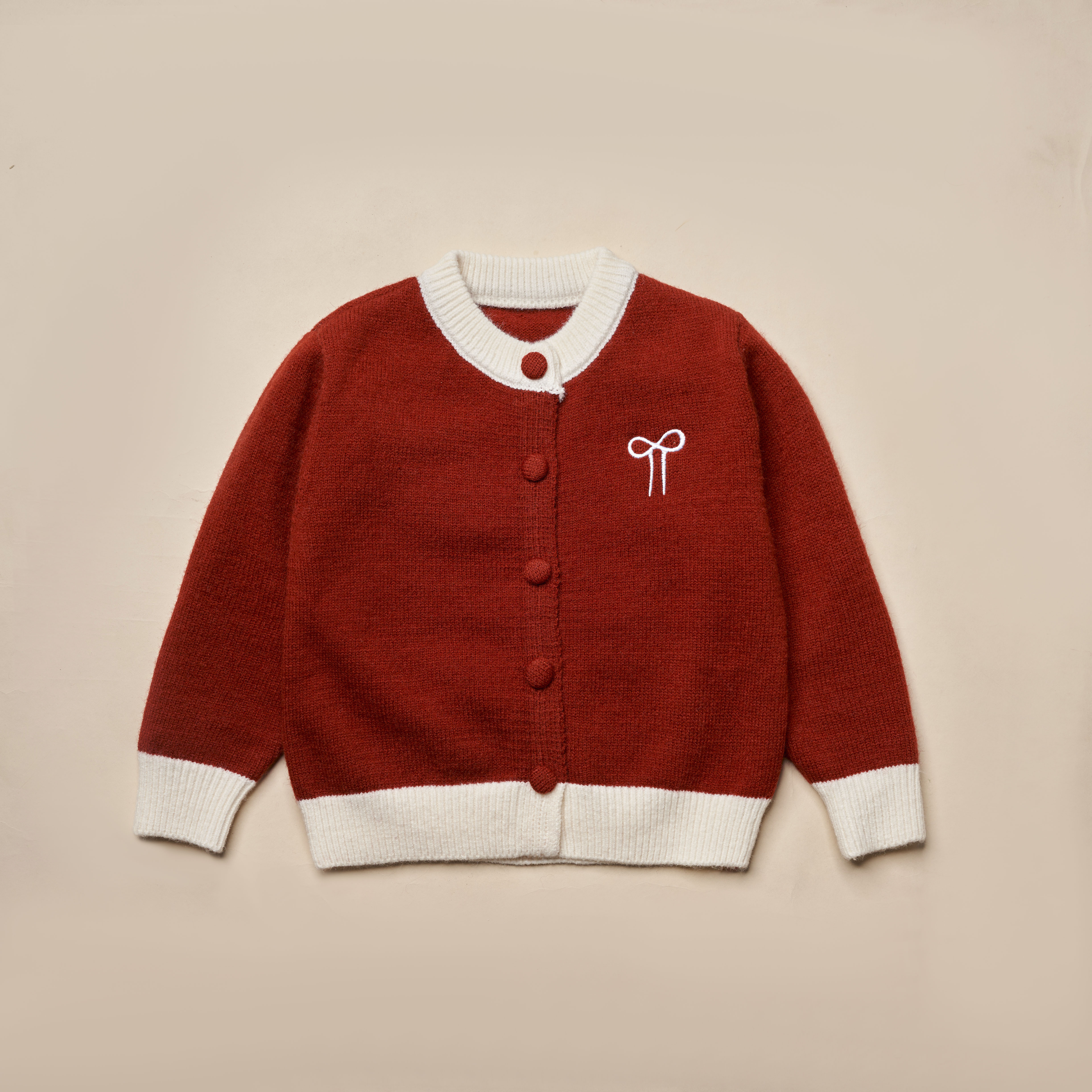🌸 Họa tiết áo khoác len bé gái: Áo khóac cadigan len trơn, thuê nơ ngực trái, cúc bọc tròn, viền áo màu be.