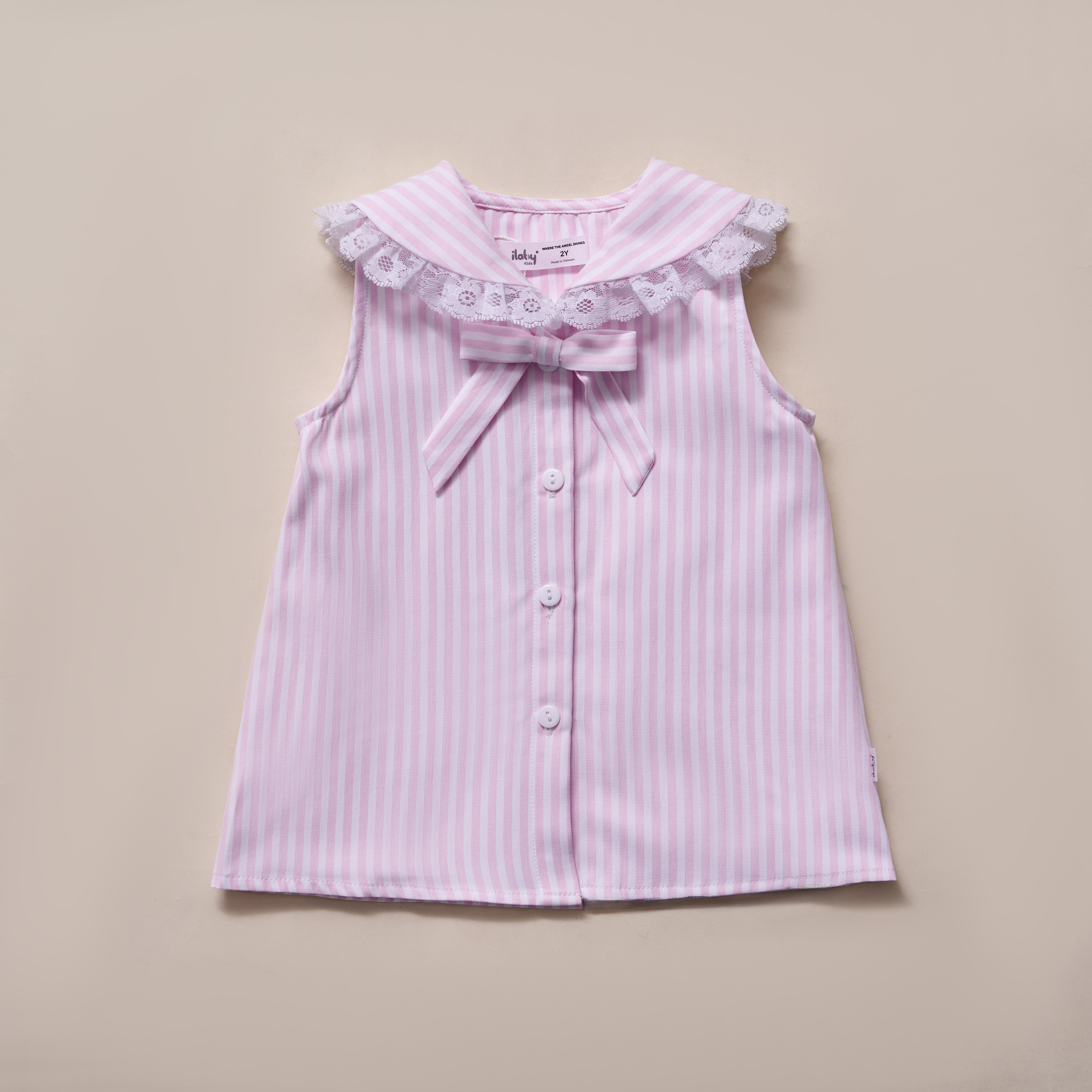 🎀 Họa tiết nổi bật váy cho bé gái: Váy bé gái cổ sen phối ren có thắt nơ phối màu ở cổ. Kiểu váy sơ mi có nẹp cúc.