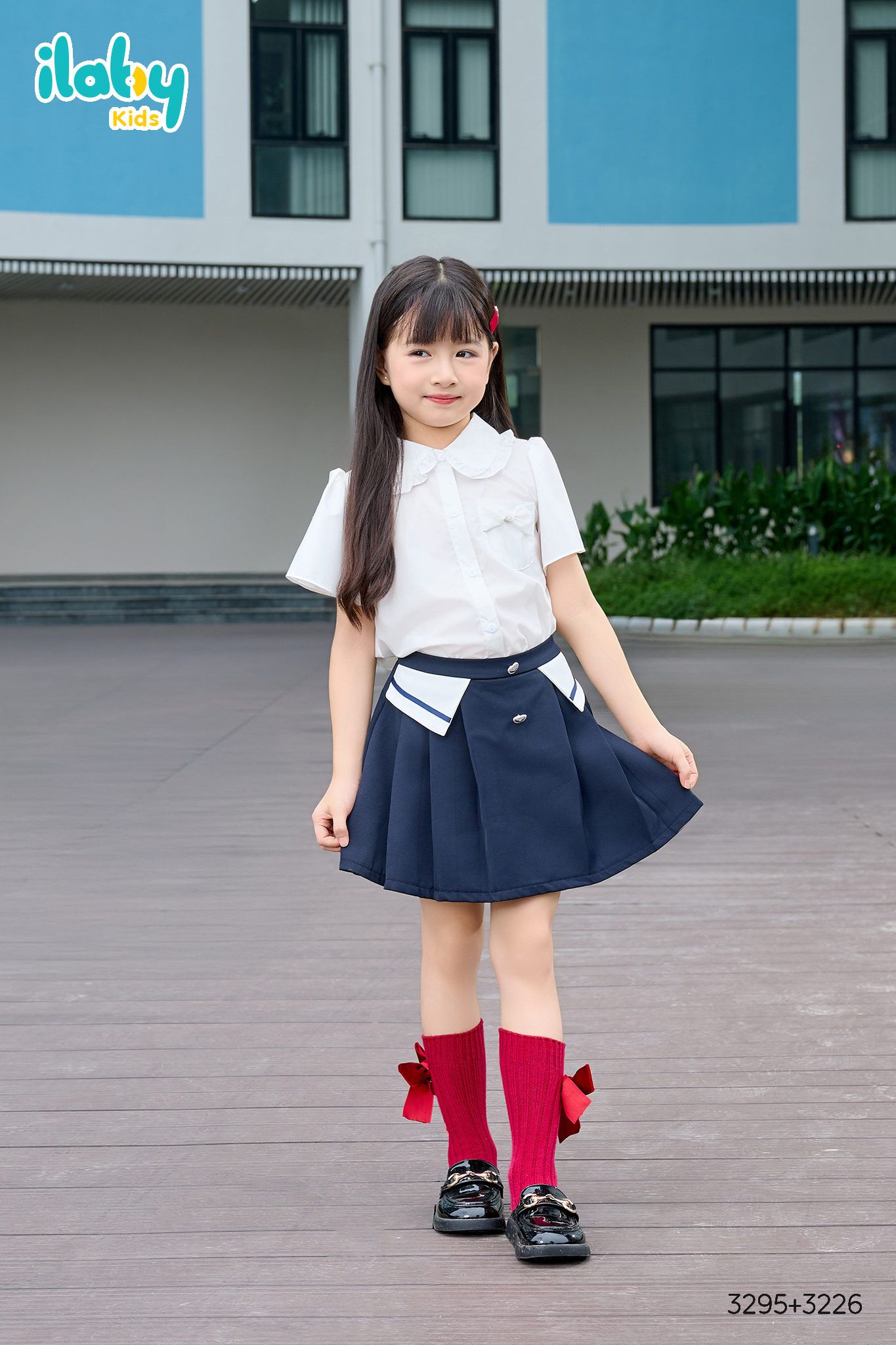 🎨 Màu sắc: Áo trắng – quần giả váy navy