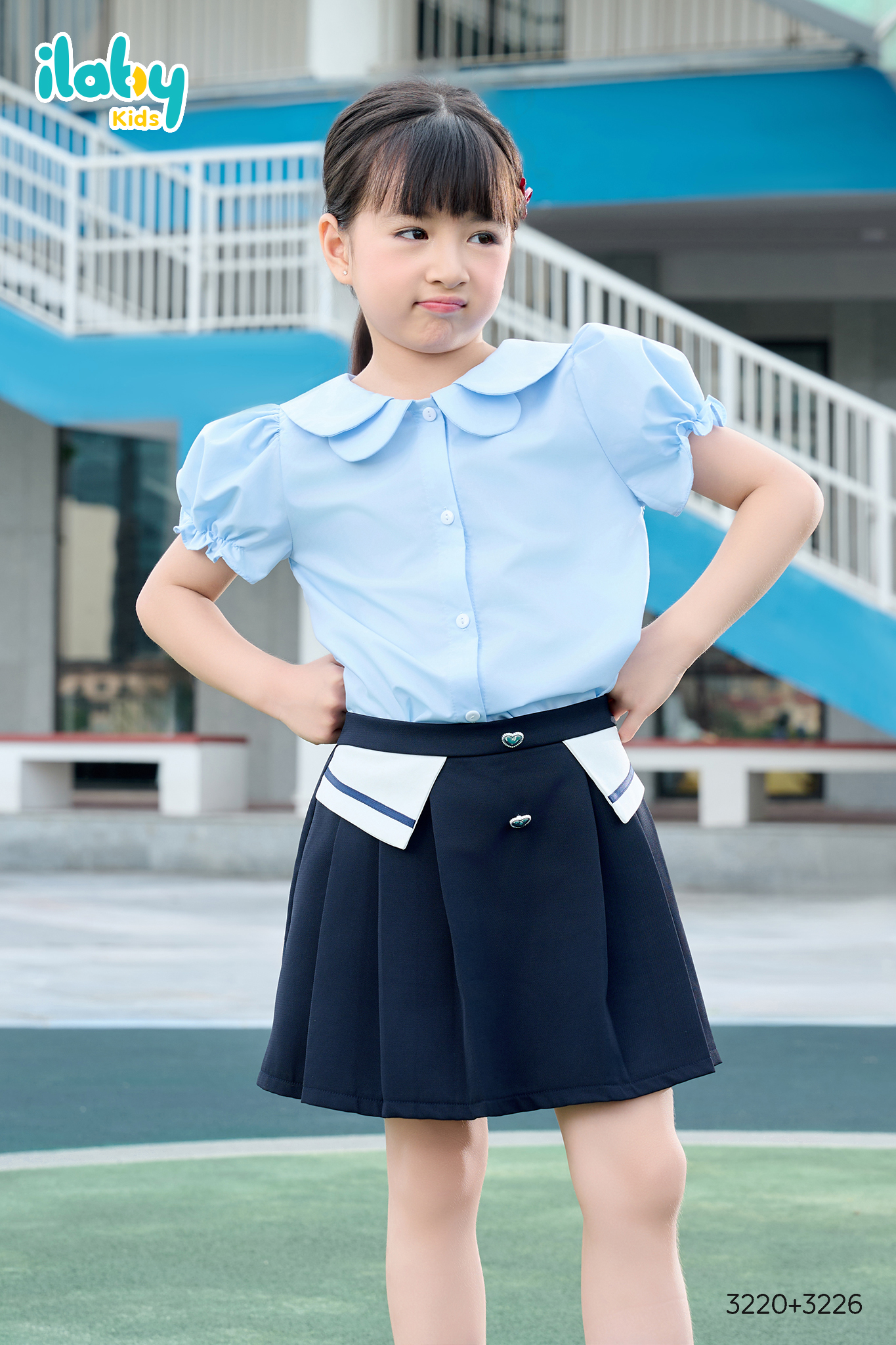 👗 Tên sản phẩm: Bộ đồng phục đi học bé gái ILABY – Áo sơ mi xanh cổ bèo tay bồng + chân váy xếp ly có nơ