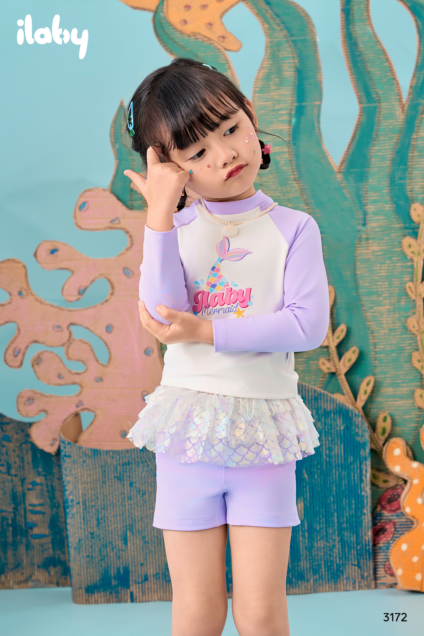 🎀 Họa tiết nổi bật đồ bơi bé gái: Bộ đồ bơi gồm áo và quần có viền ren