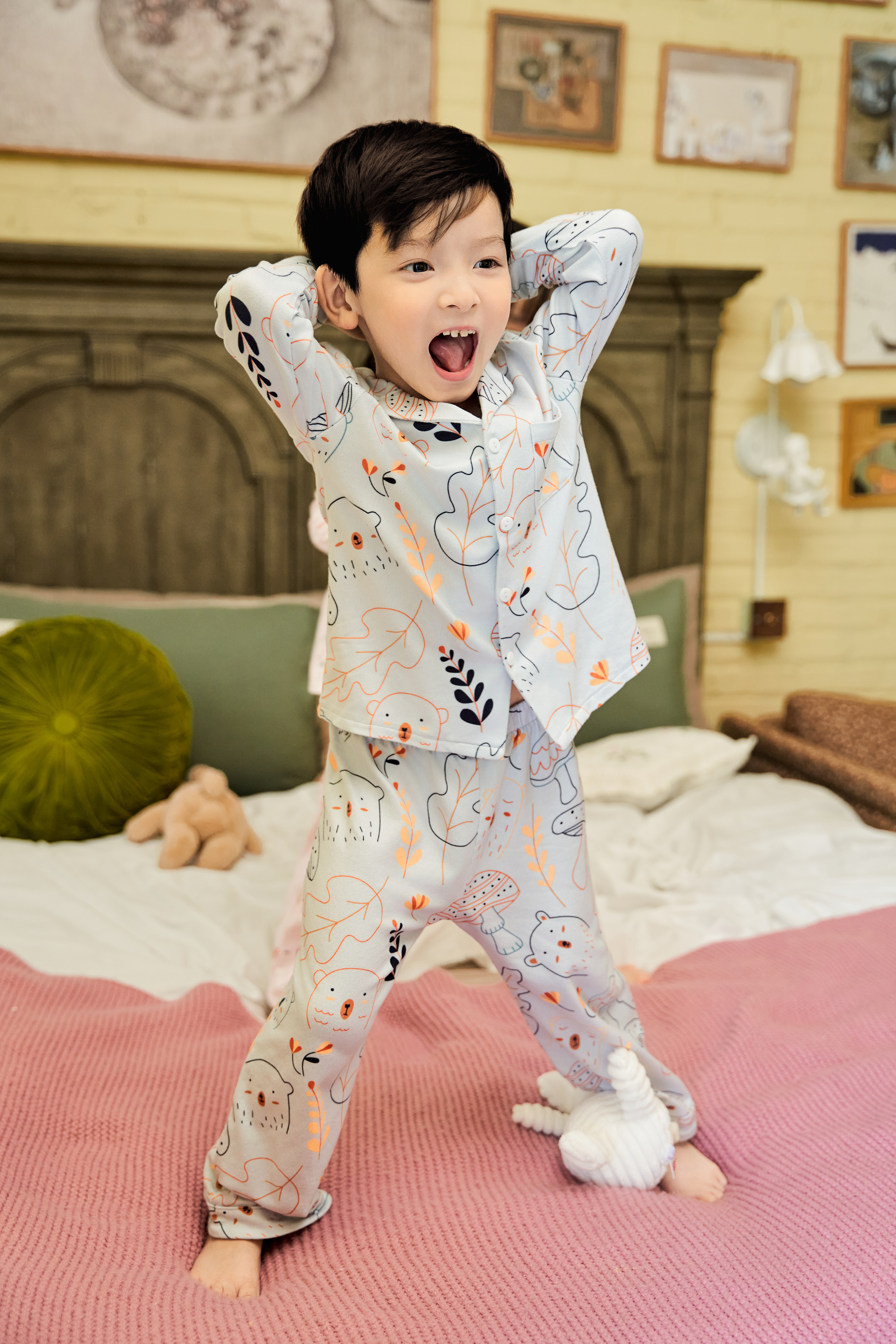 🌟 Họa tiết: Bộ pyjana bé trai cổ bẻ, cài cúc thân trước phối túi áo trang trí. Quần dài cạp chun can gấu tay gấu quần