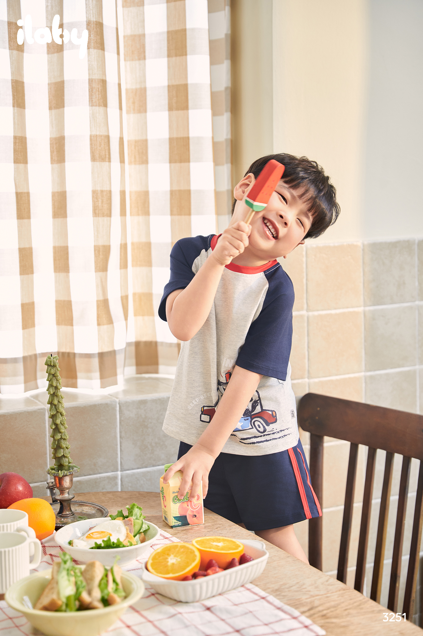 🎀 Họa tiết nổi bật đồ bộ bé trai: Bộ thun cộc tay raglan phối màu, bo cổ phối màu, hình in trang trí thân trước áo, quần màu phối sọc màu.