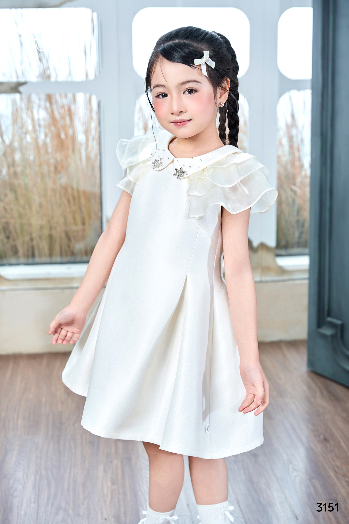 🎀 Họa tiết nổi bật váy cho bé gái: Váy dáng ôm thân trên, thân váy xếp ly súp xòe, cổ tròn, lá cổ sen đính hoa đá và đá nhỏ, phối tơ bèo ba tầng. Váy hai lớp, kéo khóa sau.