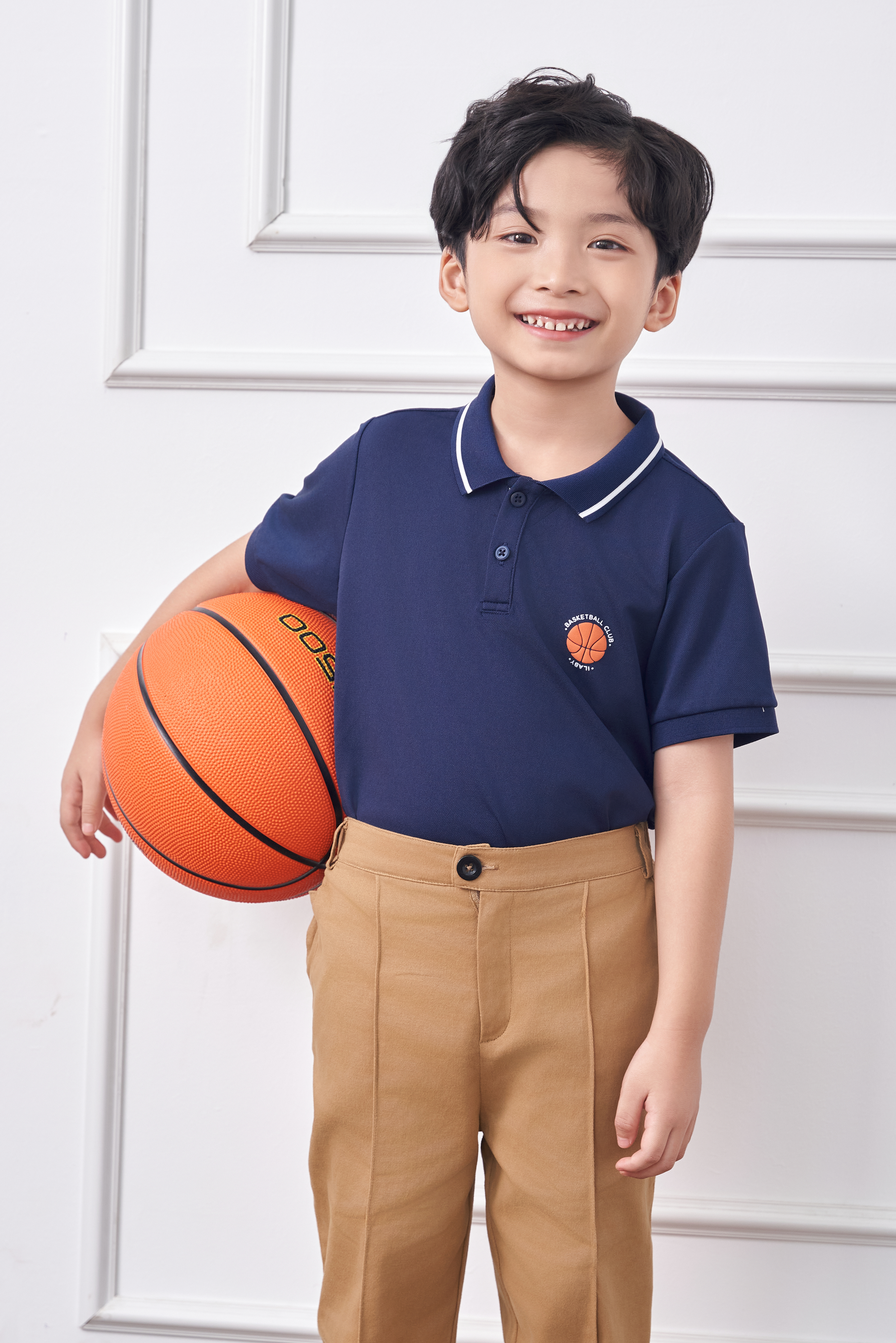 🌟 Họa tiết áo sơ mi bé trai: Áo polo bé trai cổ bổ trụ cài cúc thân trước. Họa tiết bóng rổ. Phối màu viền cổ tay, bo tay. Xẻ hai bên sườn