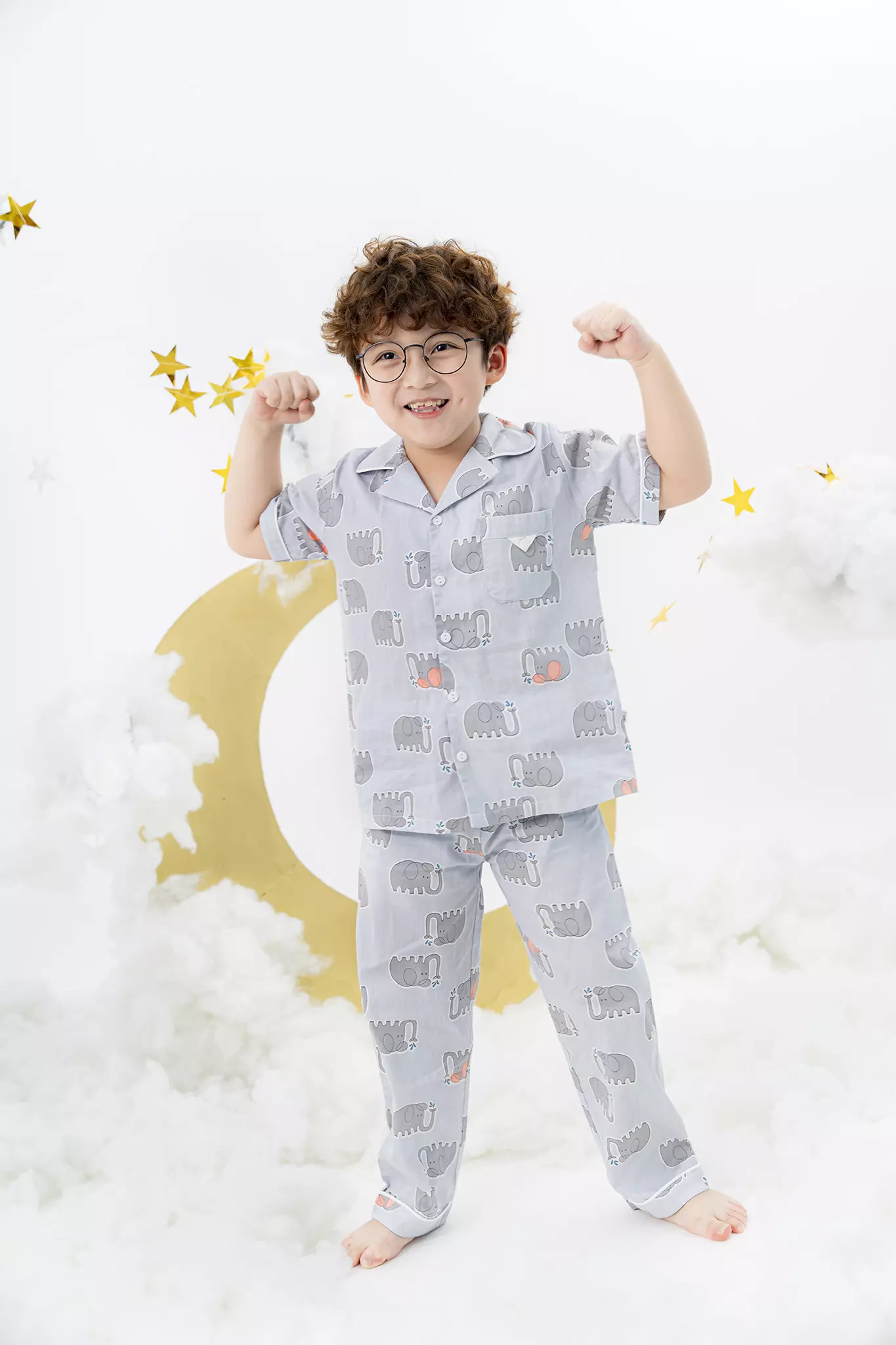 - Thiết kế: Bộ pỵama bé trai cổ 2 ve, lá cổ trên kẹp viền với những chú voi mạnh mẽ.