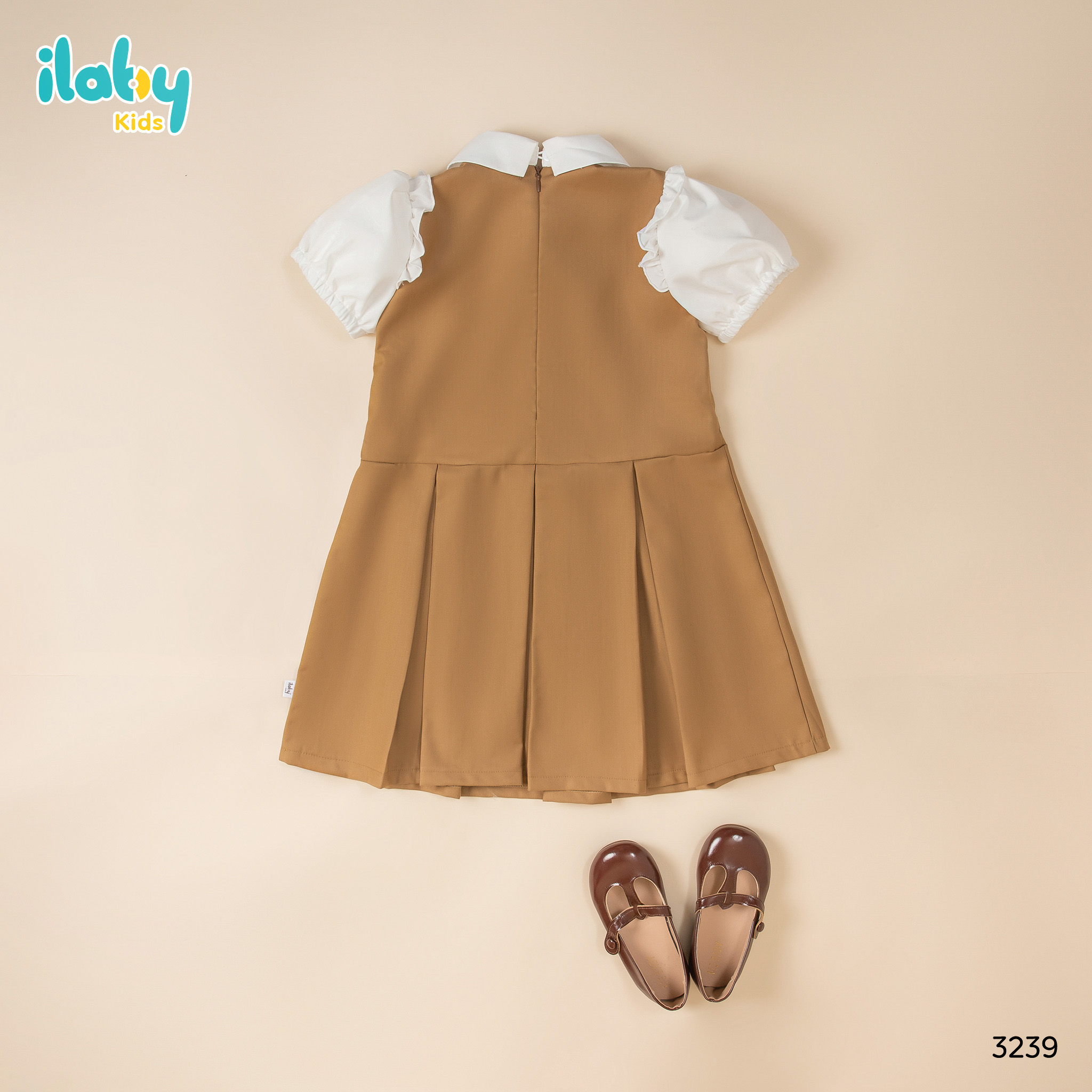 🎀 Váy bé gái ILABY thiết kế kiểu đồng phục Hàn Quốc, phối sơ mi cổ tròn tay bồng siêu đáng yêu, kết hợp váy liền thân màu nâu nhã nhặn – phù hợp diện đi học, đi chơi hay sự kiện trang trọng.