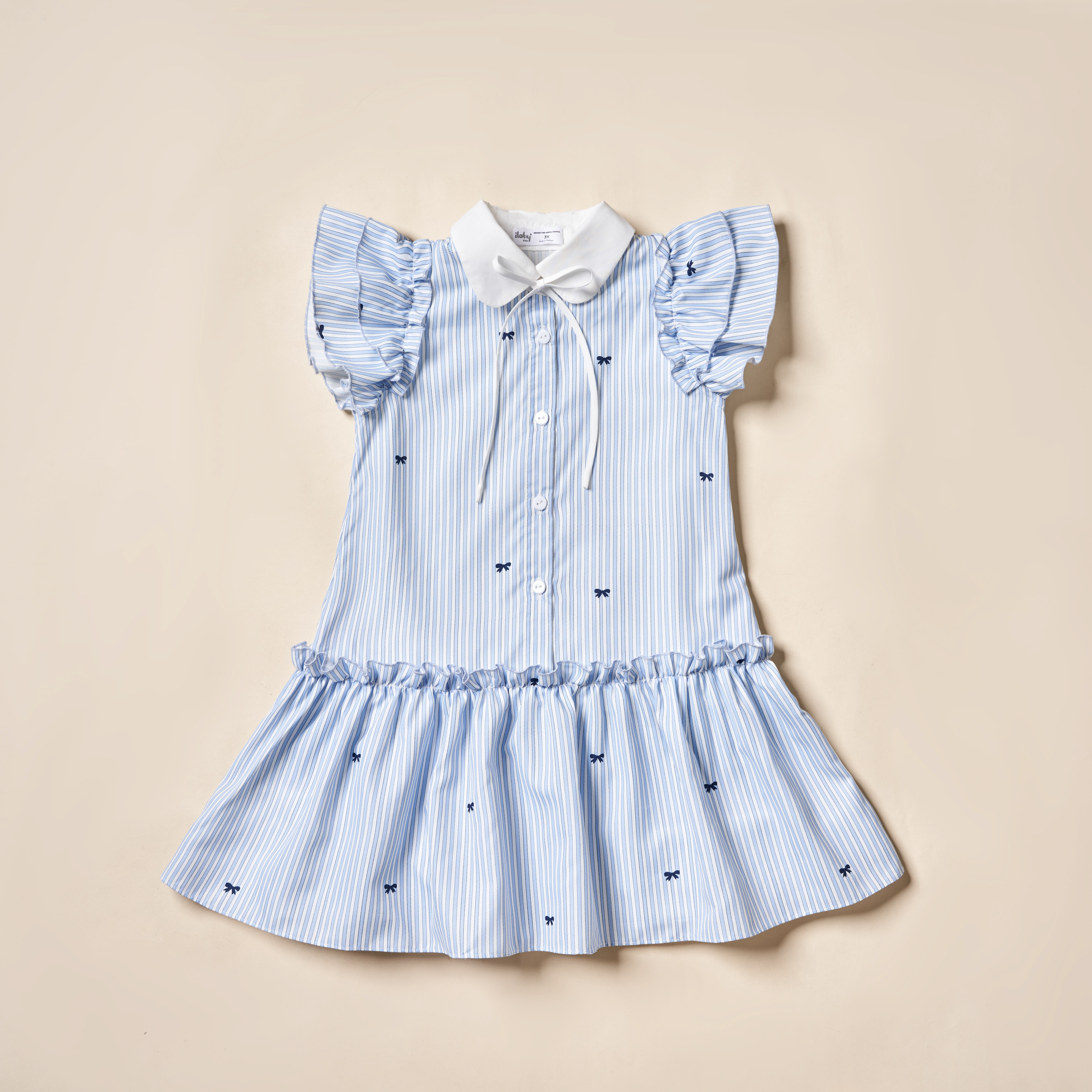 🎀 Họa tiết nổi bật váy cho bé gái: Váy bé gái cổ sen có dây lộn thắt nơ phối màu ở cổ, tay cánh tiên nhún bèo 2 lớp. Kiểu váy sơ mi có nẹp cúc. Chân váy đuôi cá nhún tùng trước