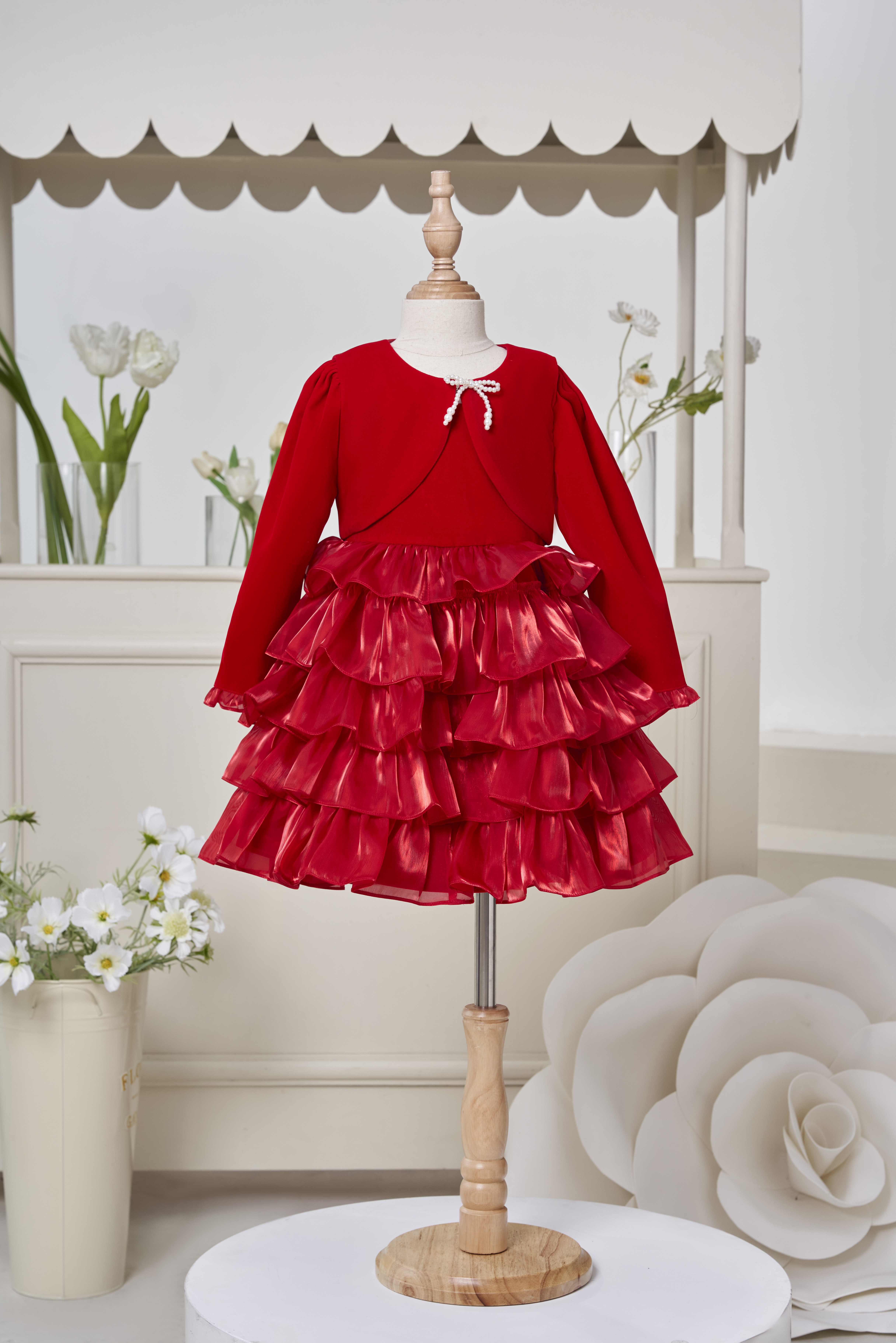 🌟 Họa tiết: Váy năm tầng bèo đính nơ xinh kèm áo khoác dễ thương