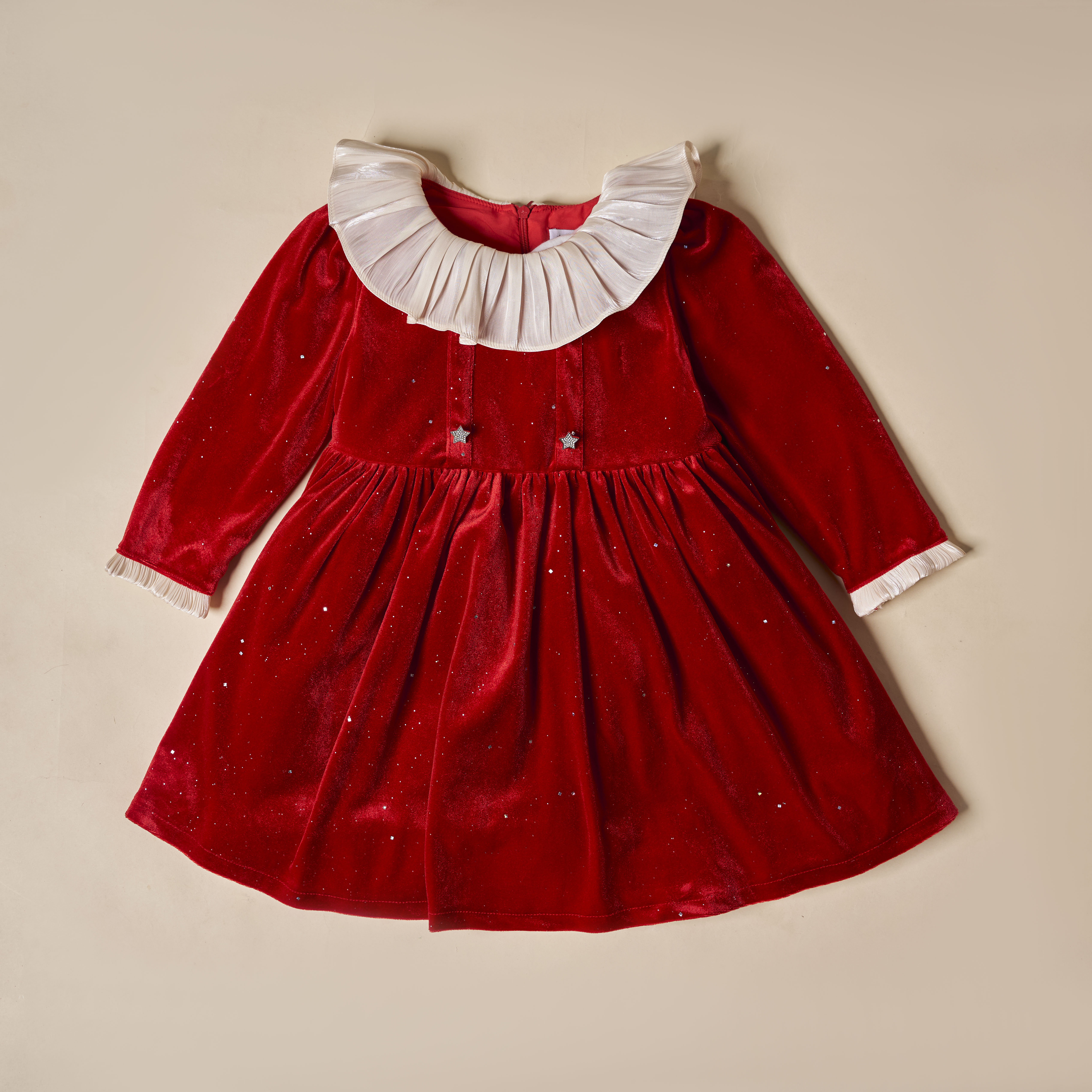 🌟 Họa tiết: Váy dài tay cổ tròn, có lá cổ vải phối tơ xếp ly. Dáng cắt eo, tùng nhún xòe bên dưới, vải nhung bề mmặtcos sequin lấp lánh, tay dài cửa tay phối bèo tơ. Váy kéo khóa giọt lệ thân sau, trước ngực đính cúc đá hình ngôi sao trang trí.