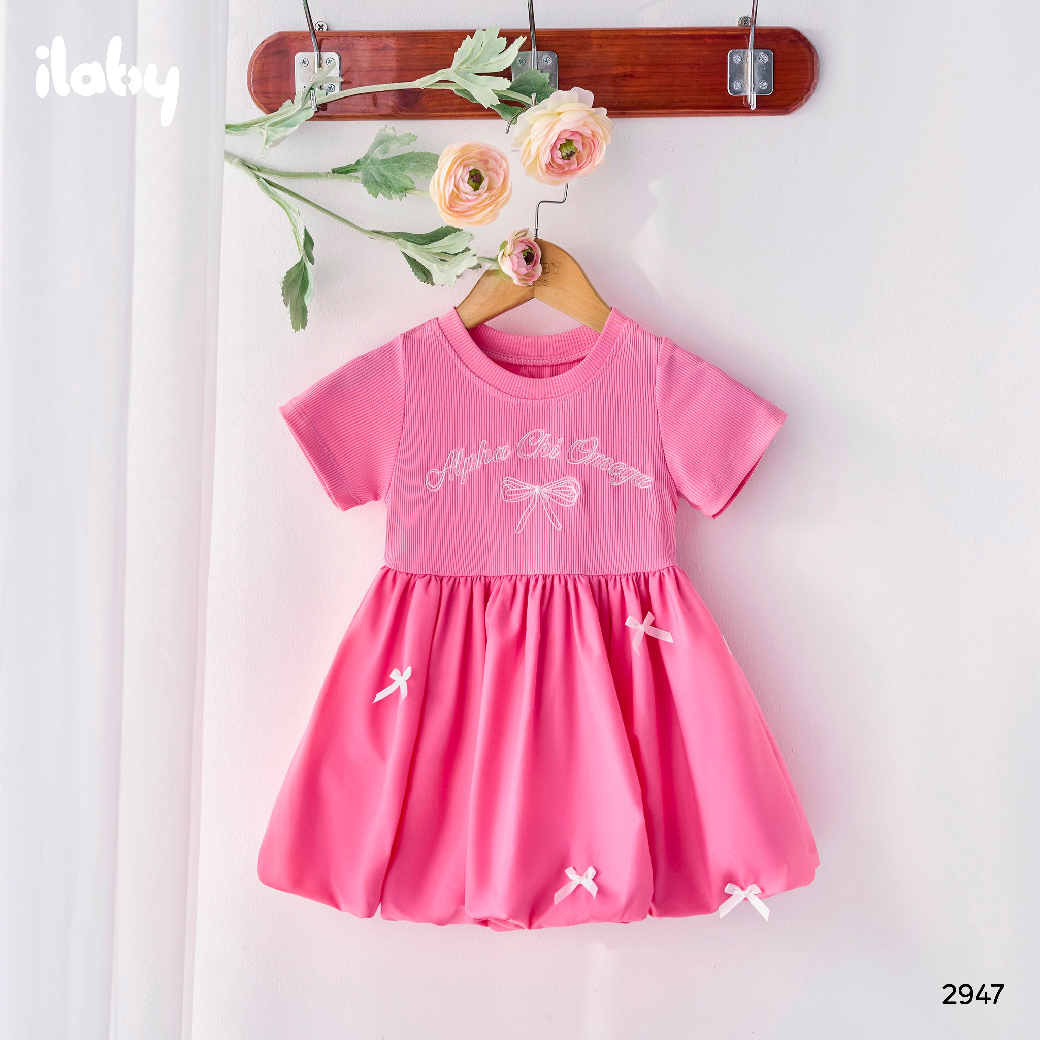 🎀 Họa tiết nổi bật váy cho bé gái: Váy thun tăm cổ tròn cộc tay phối tùng bí ngô vải thô giặt lót bông, đính nơ màu trang trí. Có thêu thân trước áo trang trí