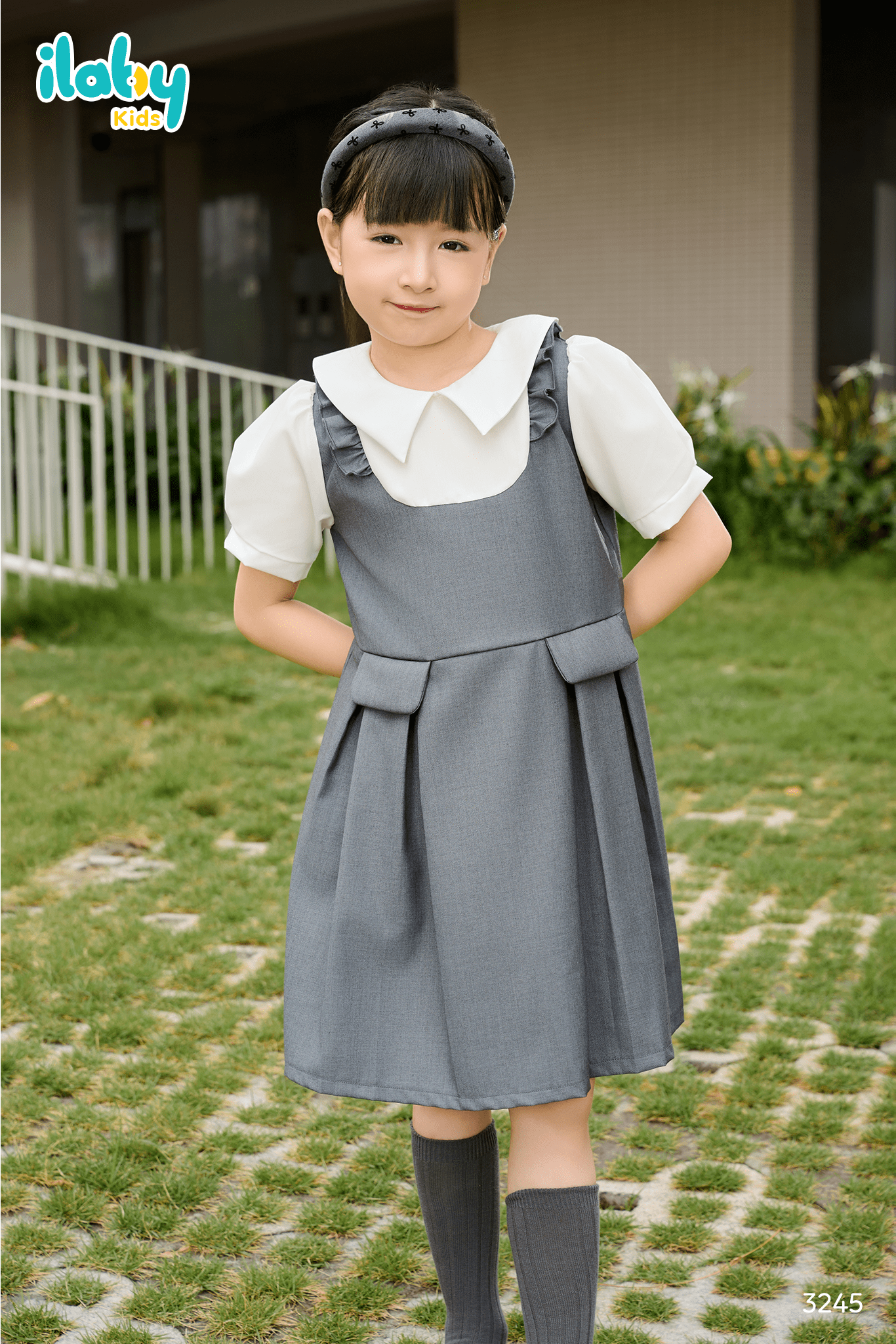 Thiết kế liền thân mô phỏng kiểu đồng phục học sinh – cổ sơ mi trắng phối tay phồng sang trọng