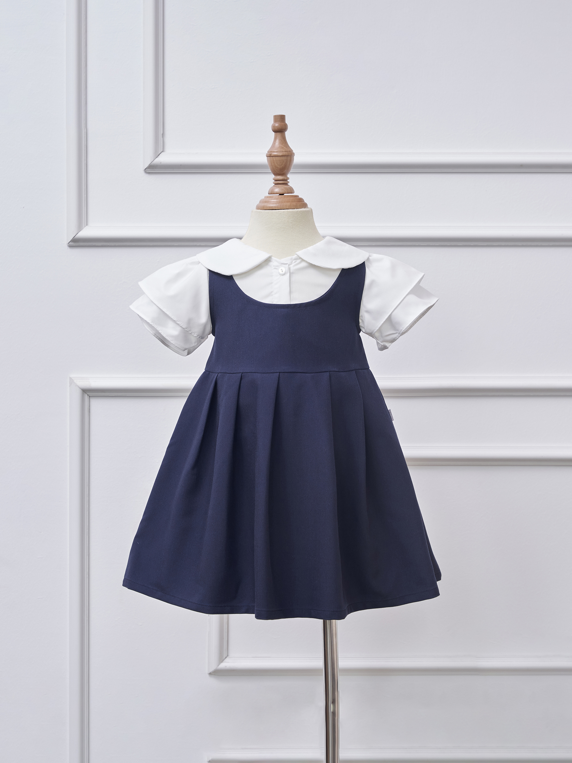 🌟 Họa tiết: Yếm xếp ly cổ tròn basic, màu than bé xinh đi học